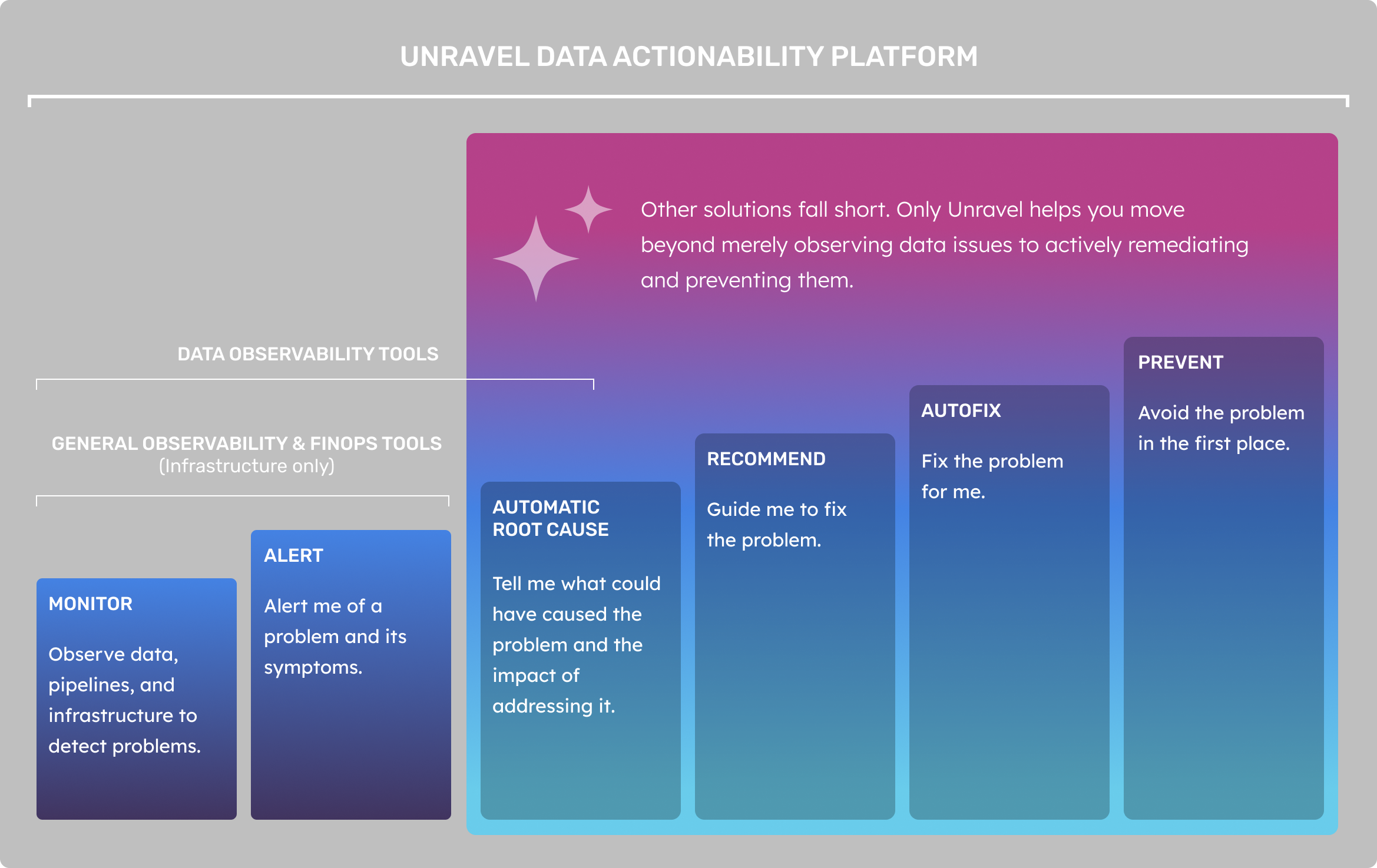 Unravel stands out among FinOps and data observability solutions by excelling in all three FinOps stages: inform, optimize, and operate. Beyond merely providing cost information at the account, project, business unit, or Line of Business (LoB) levels, Unravel integrates app-level usage data to offer detailed chargeback and trend analysis at the workspace, cluster, and user levels.
